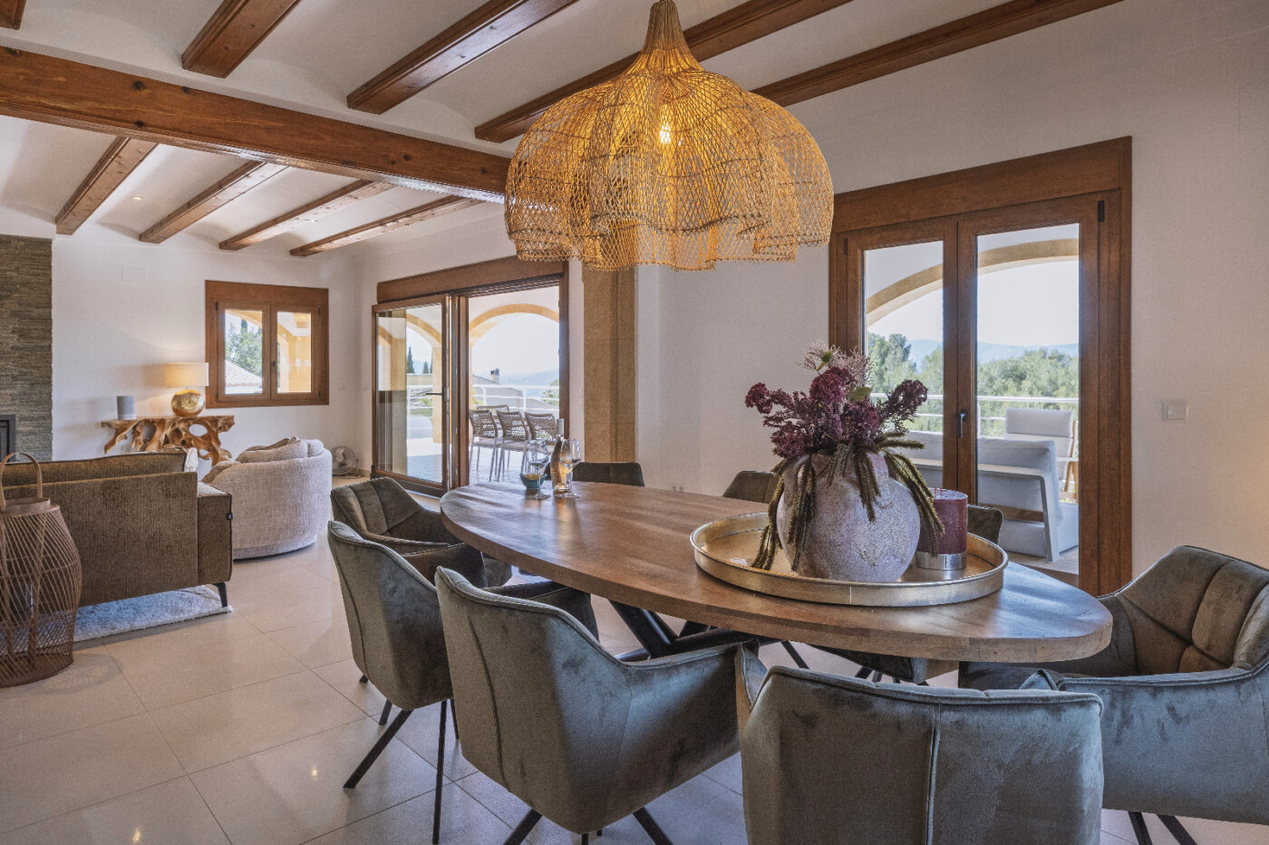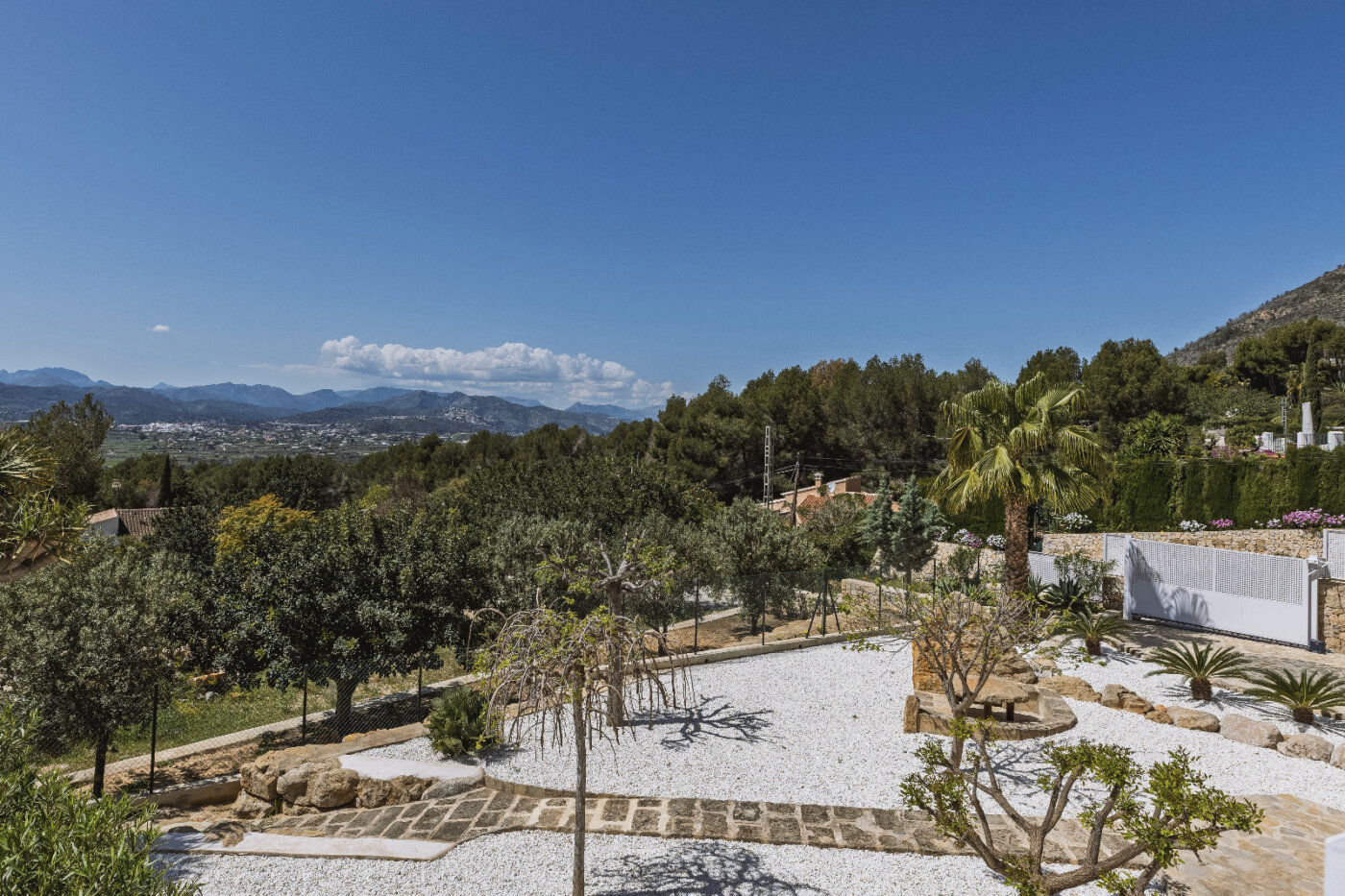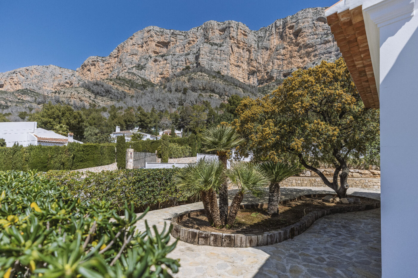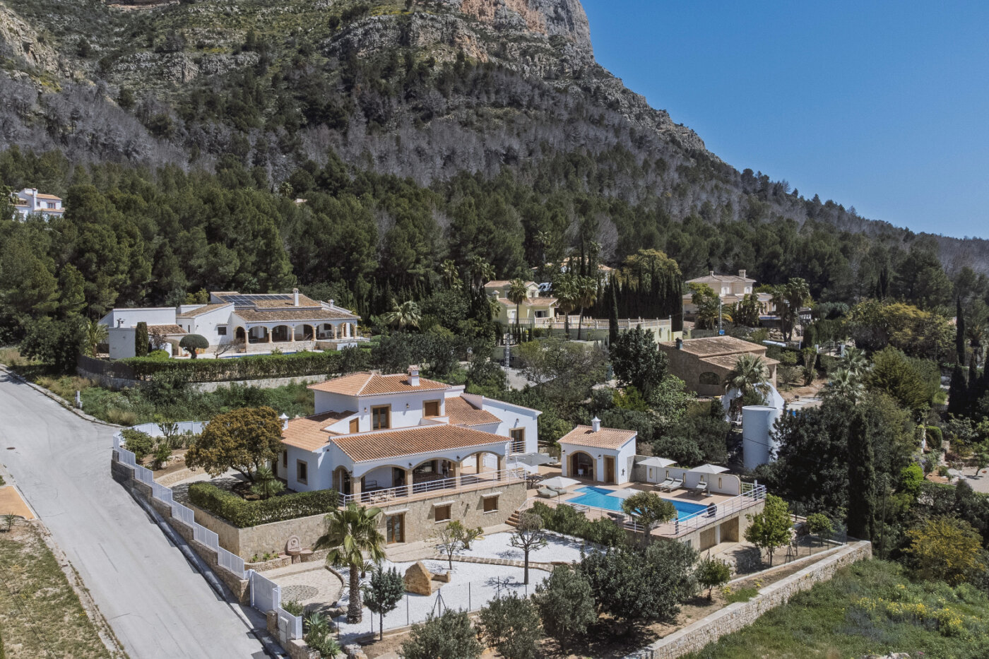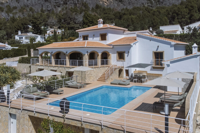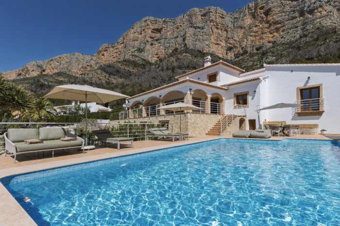 Surrounding the villa is a large garden with a private pool, outdoor kitchen, and magnificent views of the impressive Montgó mountain.