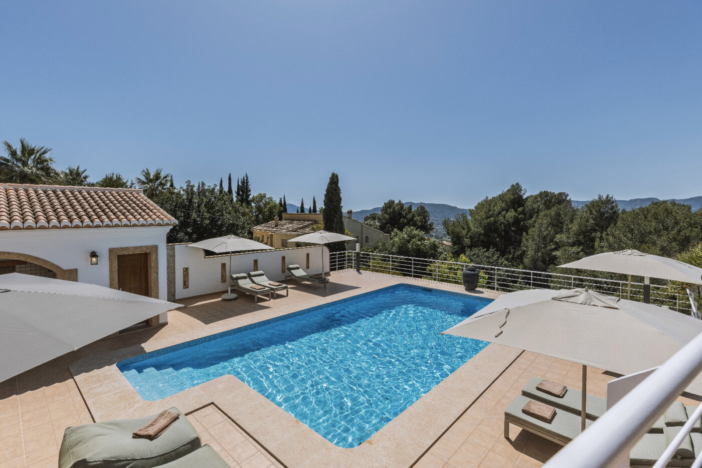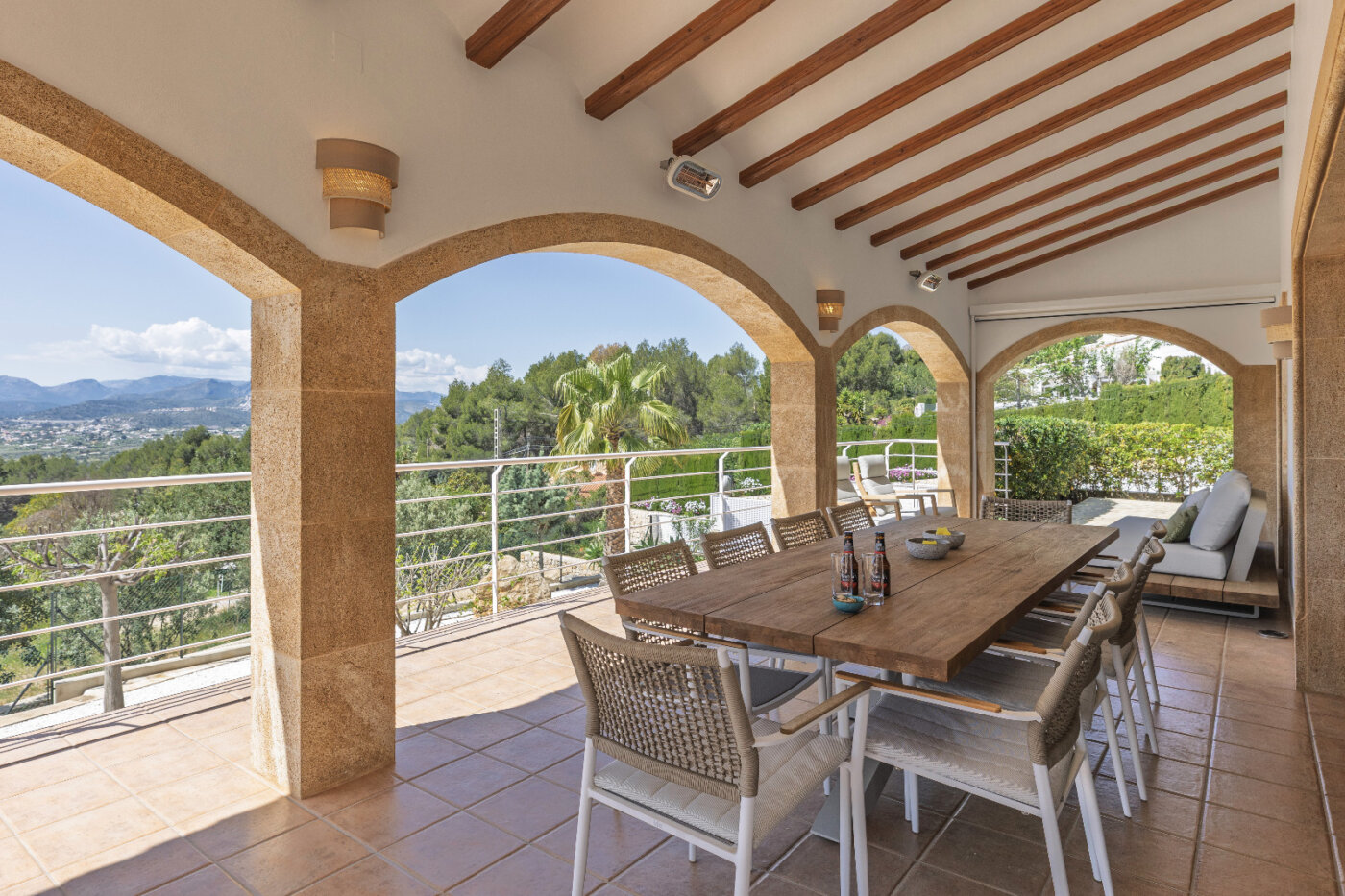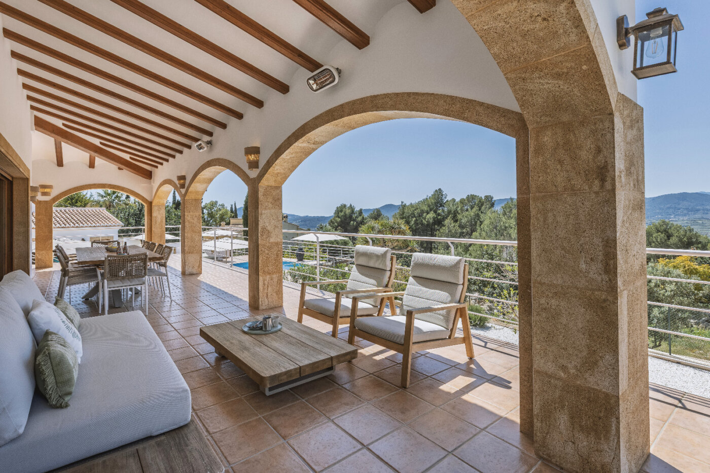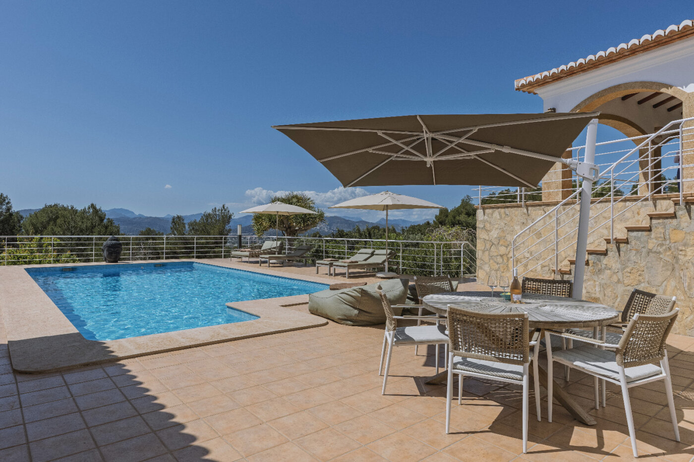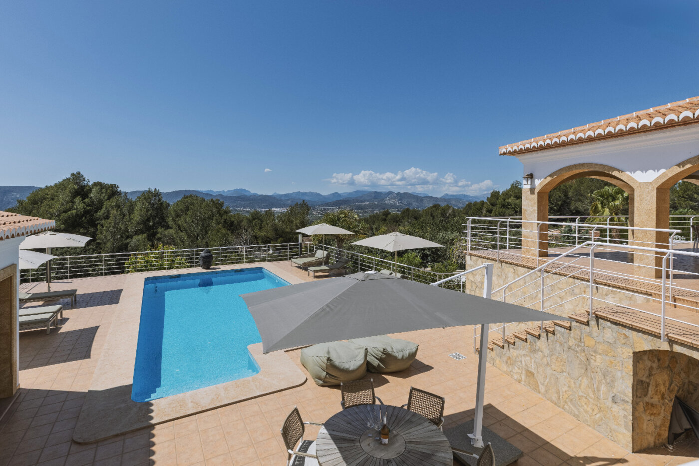 Surrounding the villa is a large garden with a private pool, outdoor kitchen, and magnificent views of the impressive Montgó mountain.
