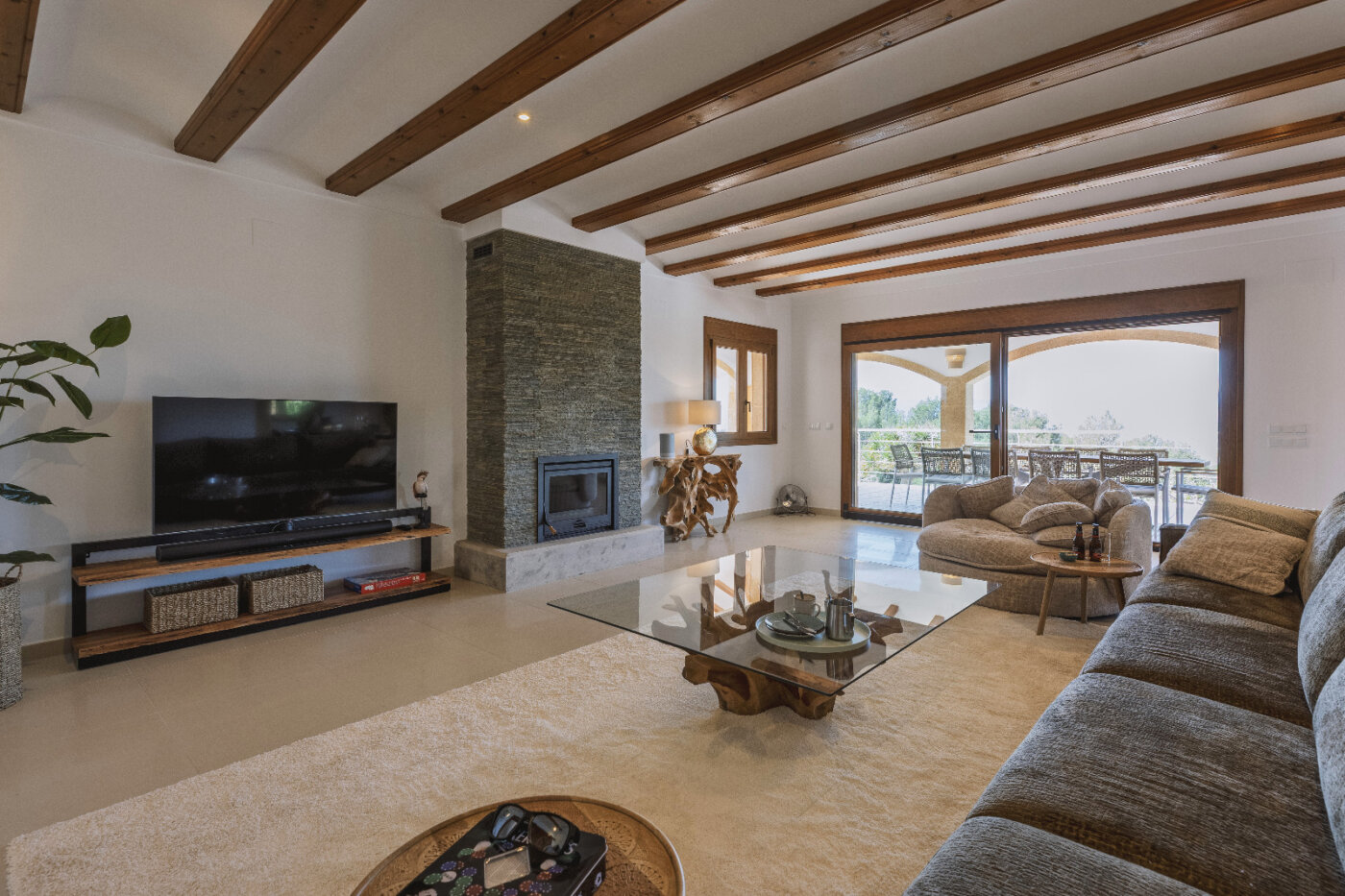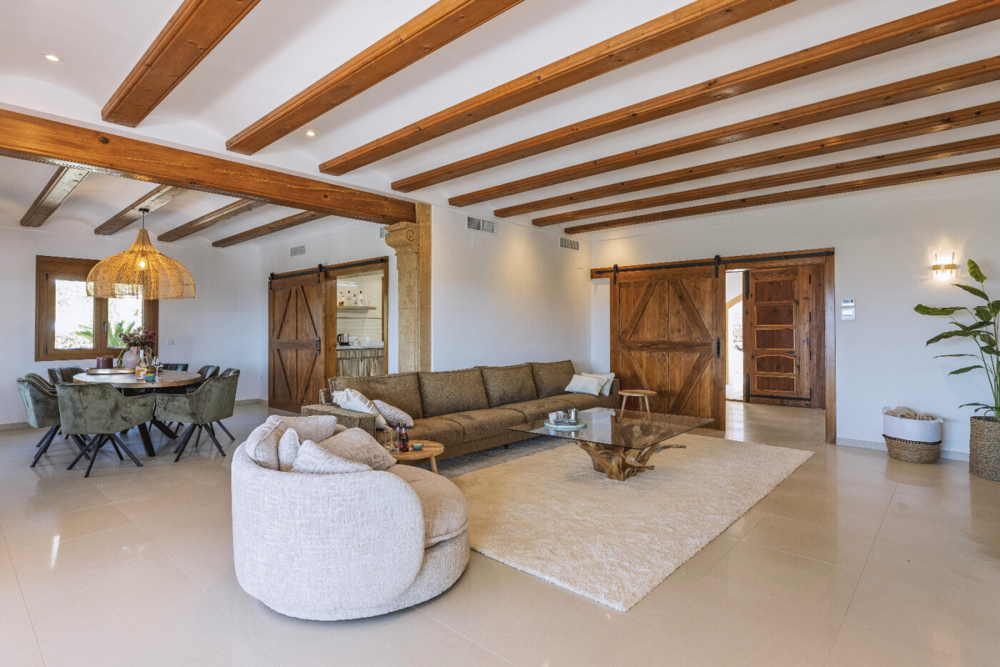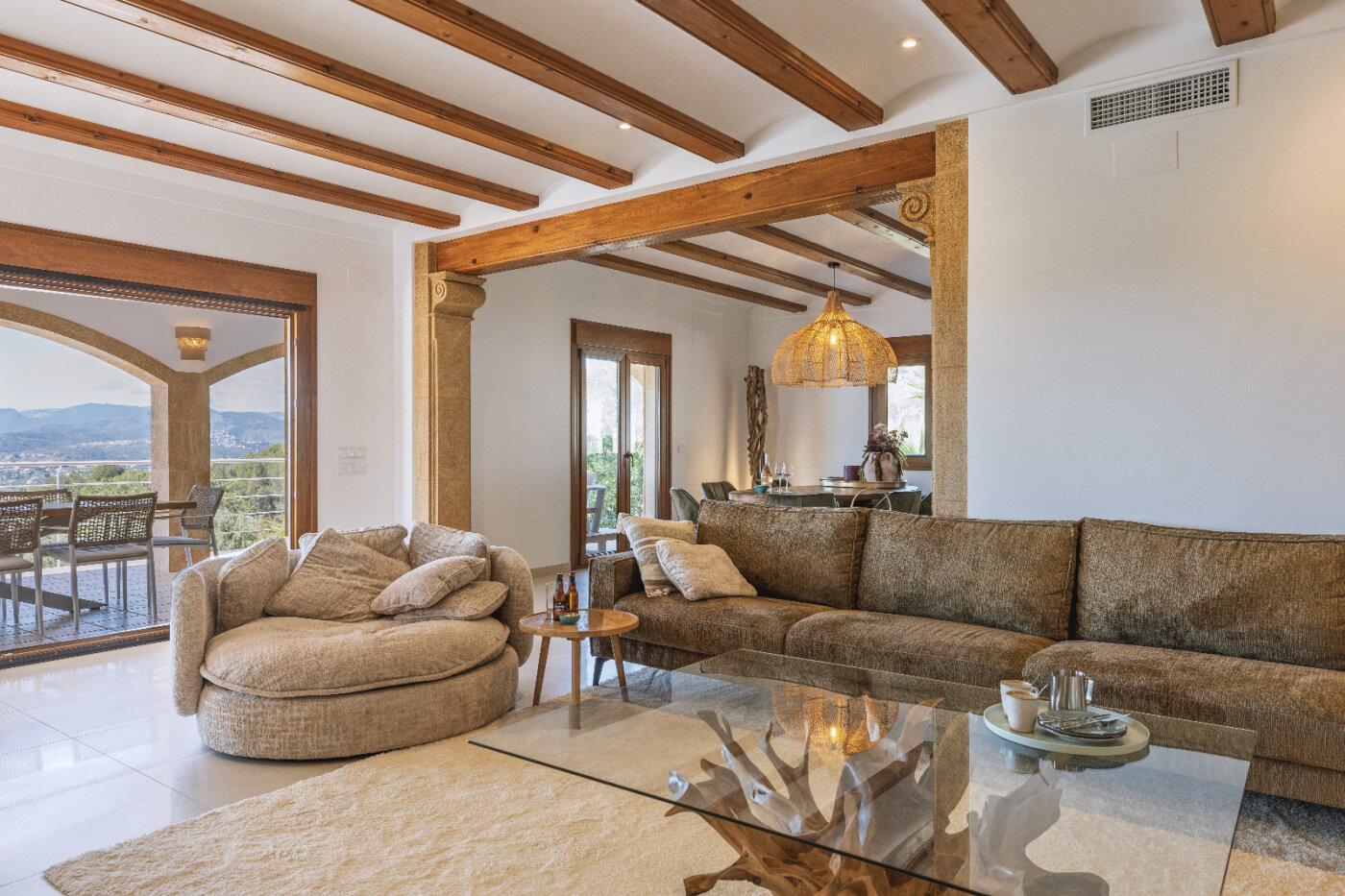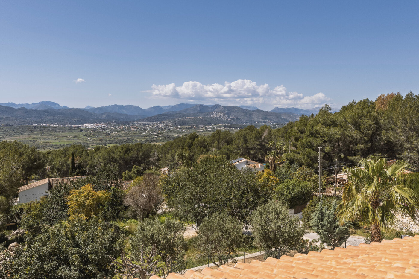 Surrounding the villa is a large garden with a private pool, outdoor kitchen, and magnificent views of the impressive Montgó mountain.