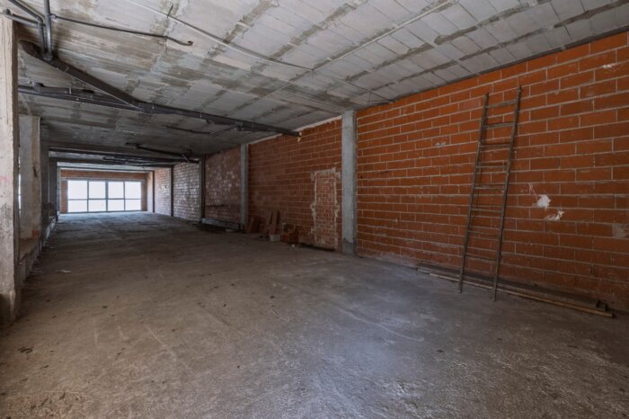De ruimte is nog onafgewerkt, wat volop mogelijkheden biedt om deze volledig naar eigen wens en stijl in te richten. Een pand met veel potentieel op een zichtlocatie.