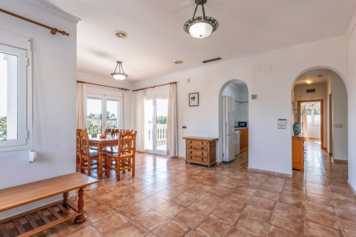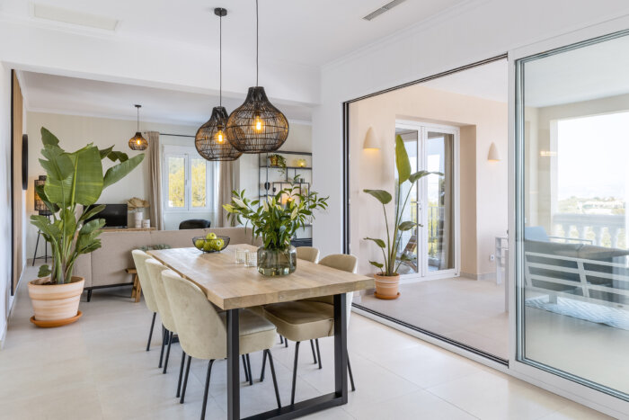 Openslaande deuren leiden tot het terras en vanuit de woonkamer en keuken kun je nu genieten van het prachtige uitzicht dat deze villa te bieden heeft. De keuken is geheel verplaatst en er is een moderne nieuwe keuken voor in de plaats gekomen.